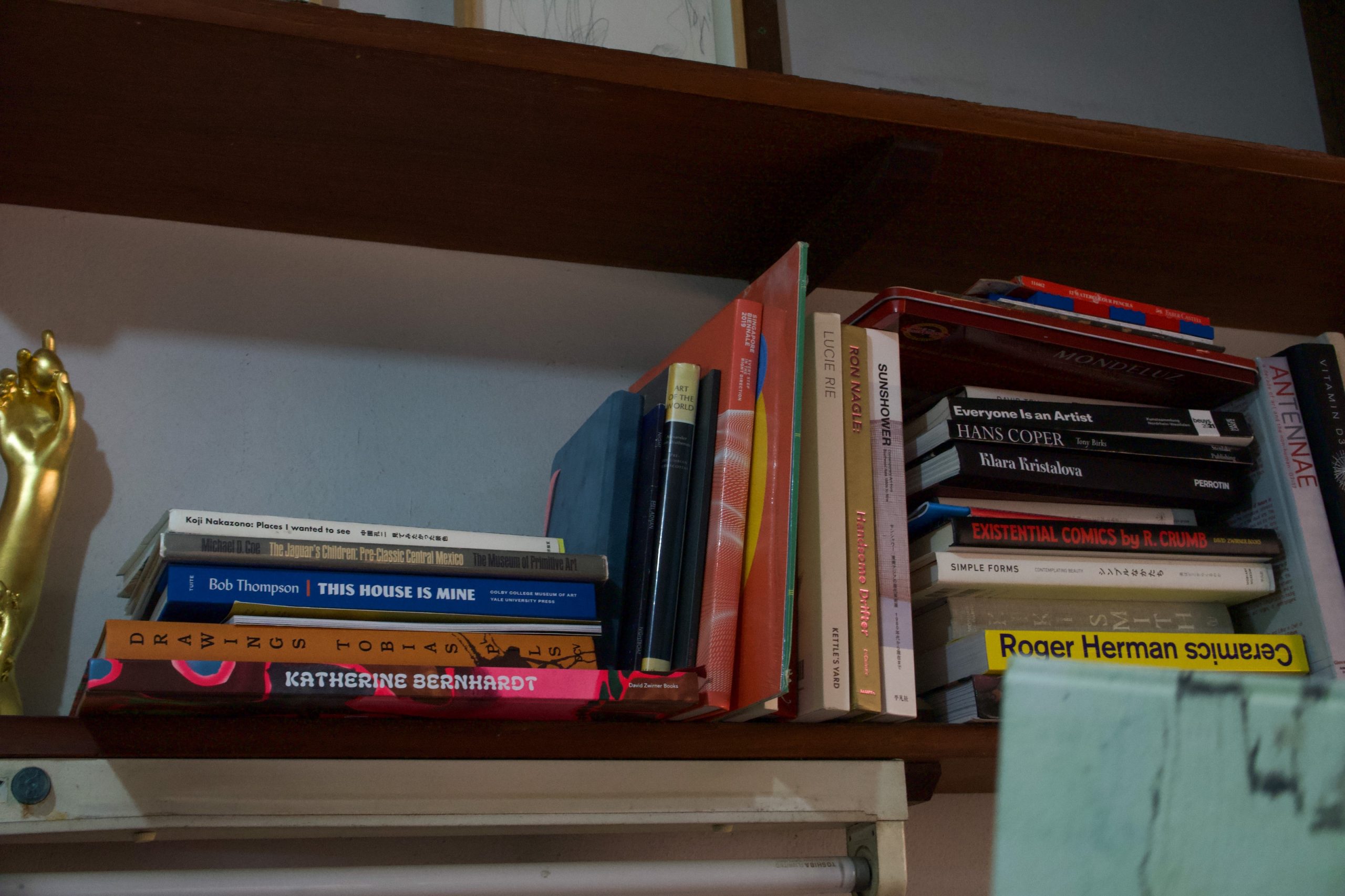 พูดจบก็ผายมือชี้ไปรอบห้อง จินตนาการไปว่าถ้าจะรีโนเวทห้องนี้ จะเพิ่มชั้นตรงไหนบ้าง เพื่อที่จะได้ขนหนังสือมาเพิ่มเพราะที่เห็นตรงนี้เป็นแค่หนึ่งส่วนสิบจากทั้งหมดที่มีอยู่ “เห็นหนังสือบนชั้นมั้ย ถ้าได้กลับไปทำงานปั้นนะ อยากจะ cast ปั้นเซรามิคเหมือนเป็นหนังสือเลยนะ แล้วเอาพวกตุ๊กตุ่นมาไว้ด้วยข้างบน”