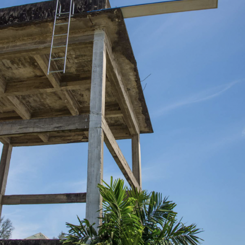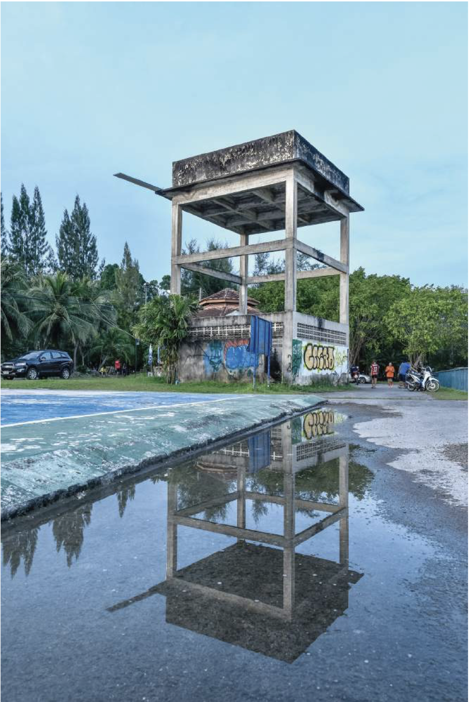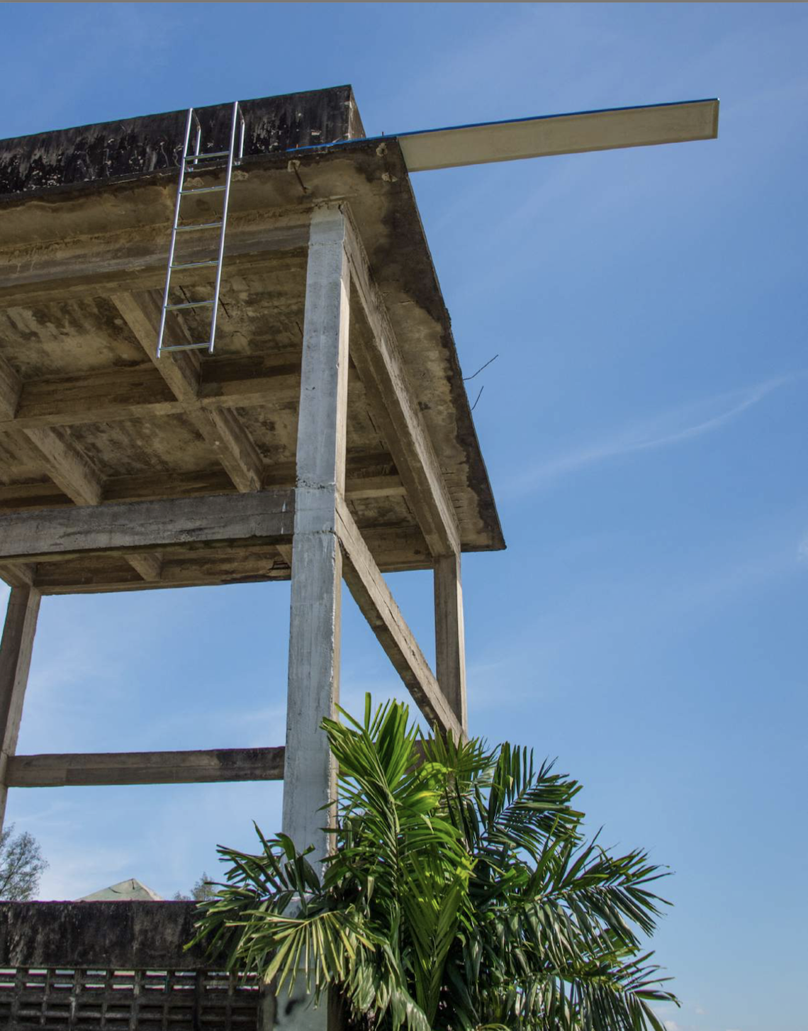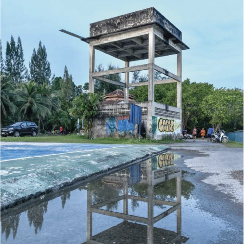 One of his works that I am particularly drawn to is I’m waiting on for the future of more water to come (2018), an installation presented during the Thailand Biennale Krabi. [I later came across a digital version of the festival catalogue, which can be read at this link.] For that project, he chose to install a diving board and a pool ladder onto an abandoned concrete structure, whose height suggested that it might once have functioned as a small water tank or emergency reservoir. Both the structure and the work were located within a public park, requiring a certain degree of looking, tilting one’s head upward or scanning the surroundings to even notice it. What interests me is the sense of displacement in the work like how it seems out of place, whether in relation to the abandoned structure itself or the surrounding environment that offers no clear support. “What did you want to do at the time? It’s a question I’ve been wanting to ask for a while, but I could never find any information about it online.”