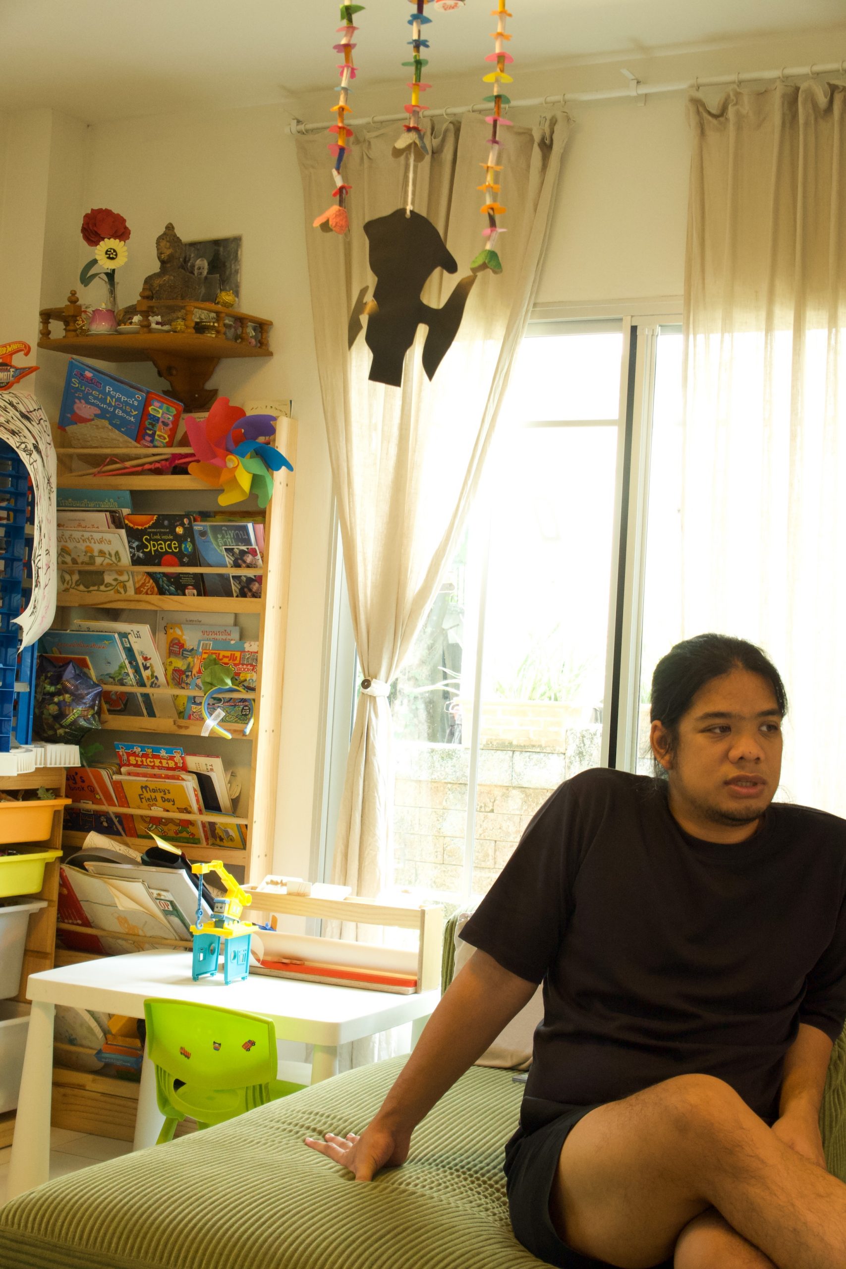 ด้านหลังของนวินเป็นแค่หนังสือเด็กและของเล่นเศษเสี้ยวส่วนหนึ่งที่มีทั้งหมดในบ้าน ด้วยความที่ภรรยาของเขา ณัชนาถ กระแสร์ชล เป็นนักศิลปะบำบัด จึงทำให้หนังสือและของเล่นสำหรับอาจารย์ ลูกชายของพวกเขา มีเนื้อหาหรือองค์ประกอบที่ช่วยเสริมสร้างทักษะทั้งทางกายและทางอารมณ์ที่เหมาะสมสำหรับเด็ก