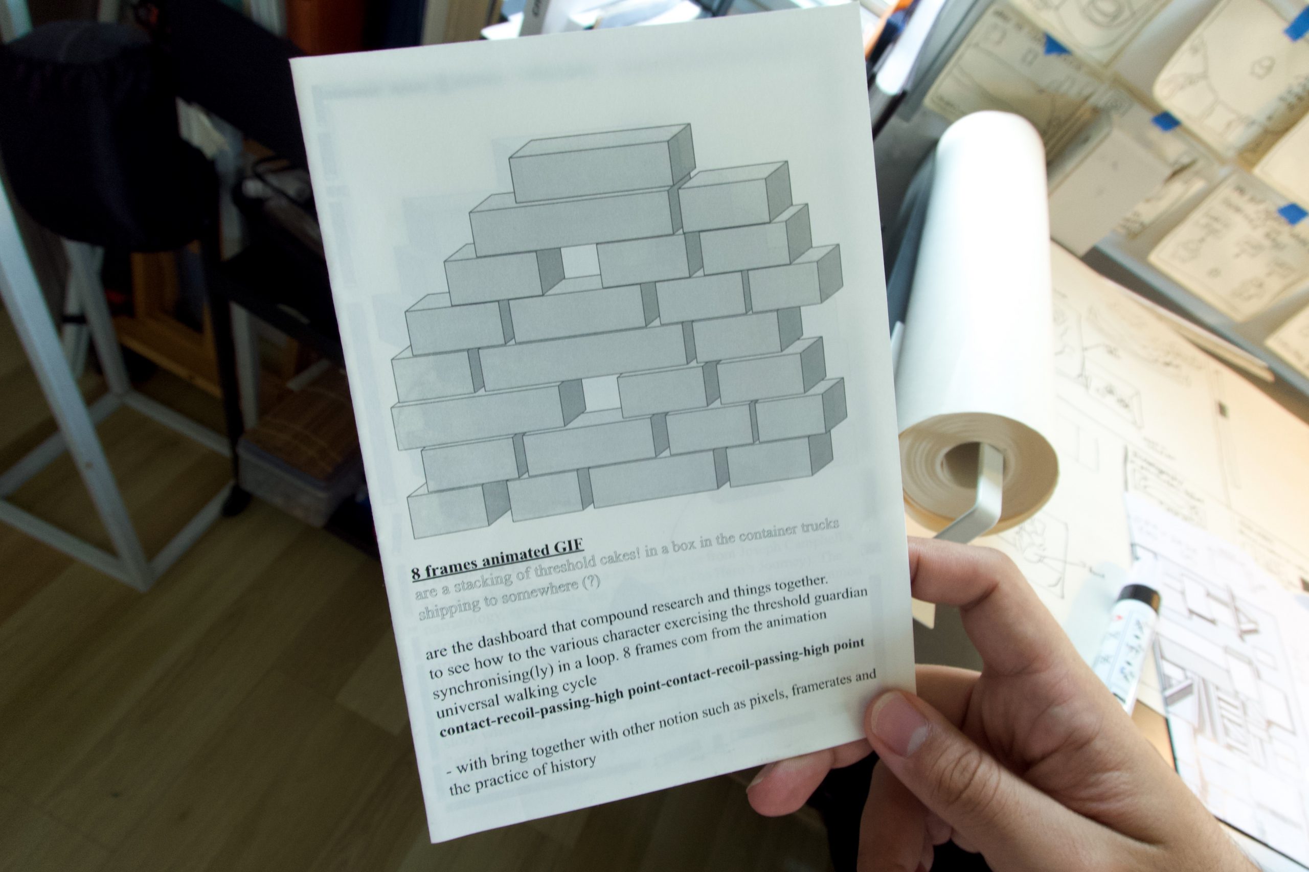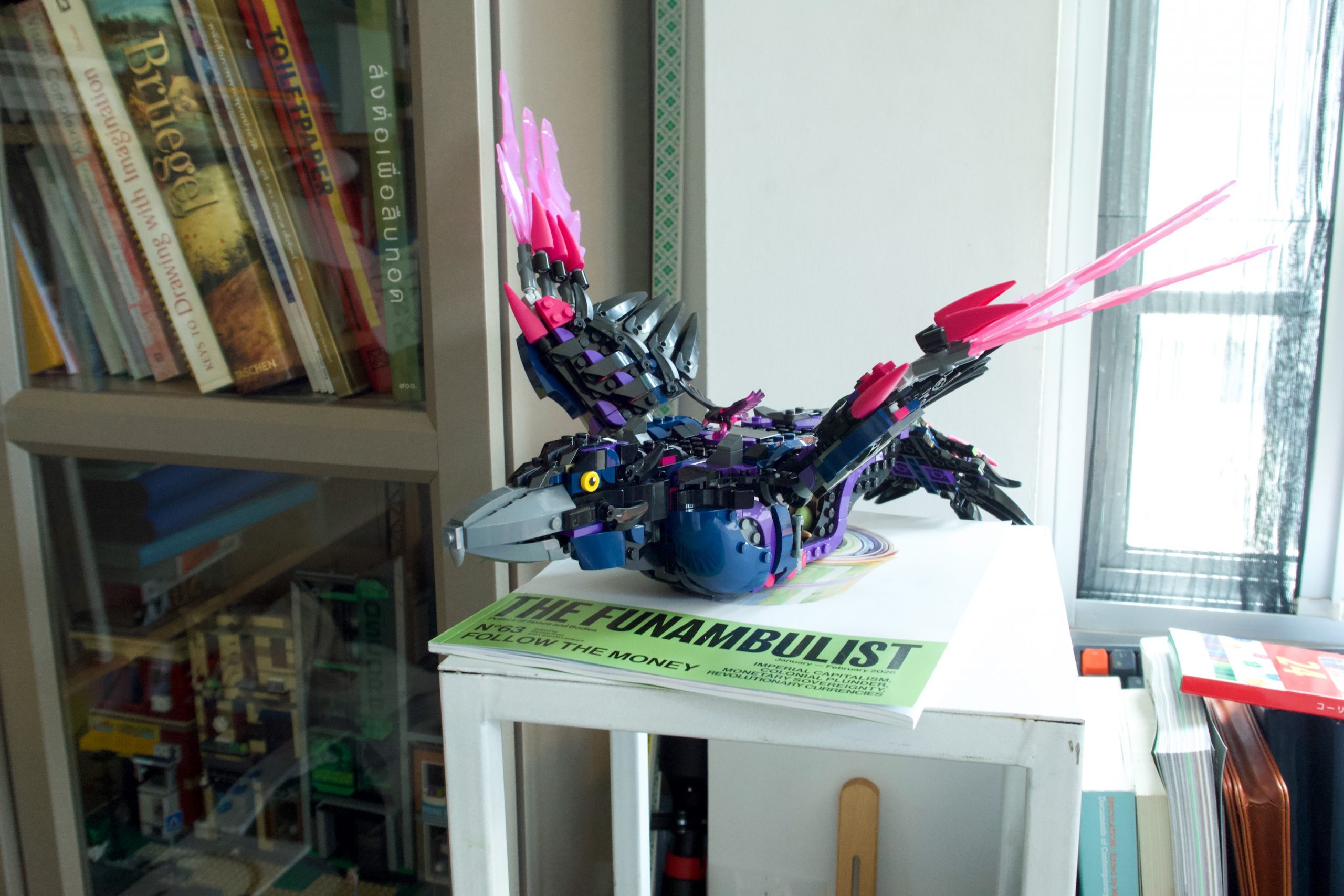 ตัวต่อรูปนกอีกหนึ่งชิ้นในห้องทำงาน ด้านล่างคือนิตยสาร The Funambulist ฉบับนี้ว่าด้วยเรื่องของเงิน ซึ่งคิดว่าคงถูกจริตความอยากรู้ของนวินเลยแนะนำให้อ่านและซื้อกลับไปตอนเจอกันรอบก่อนหน้าที่แกลเลอรี่