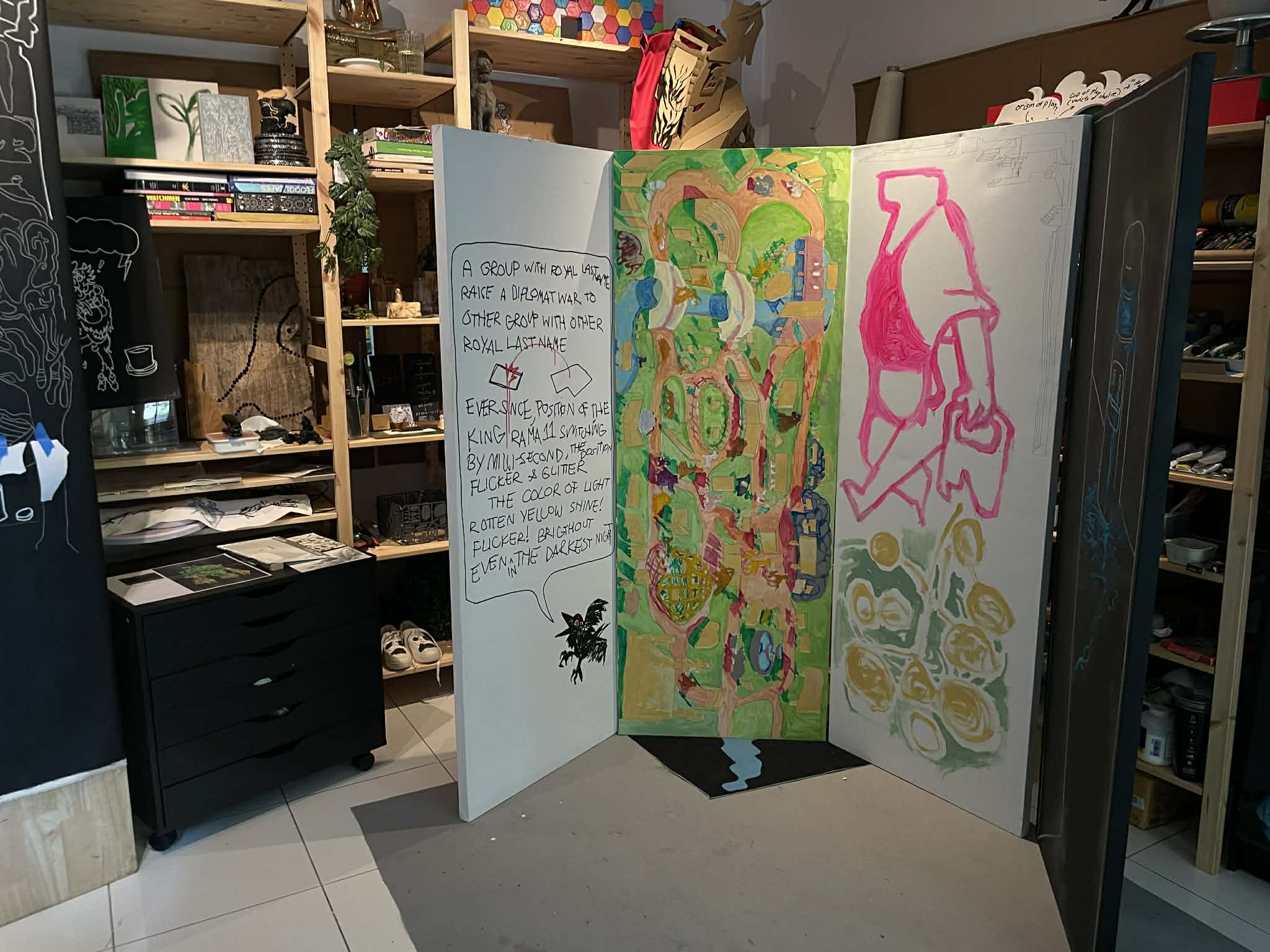 It’s probably already understood that, in terms of both market and cultural value, media-based works don’t occupy the same position as painting. And this isn’t about sympathy, nor about artists choosing to work across multiple mediums. Without the support of institutional structures whether at the level of individuals or organizations, cultural producers like artist inevitably become a kind of labor that must find ways to sustain themselves economically. “From another perspective, drawing from my background in factory business, I see that buying and selling—bringing things into the market is about more than simple exchange. The market is full of its own kinds of magic, which I’m interested in working with, in trying to locate compelling questions within it. The canvases I make don’t directly pose those questions, but they can’t escape them either. Their size and even the span of our working lives ends up being measured against a kind of ruler, until a price is assigned by the market. In the studio, works sized like doors at 180 × 66 cm are constantly being compared. I find myself asking whether the questions embedded in each piece carry an equivalent ‘volume’ of content. One panel might be a single political comic, loudly declarative; the next, a deeply expressive forest scene. And yet they are still measured against each other: do they hold the same weight of meaning?”