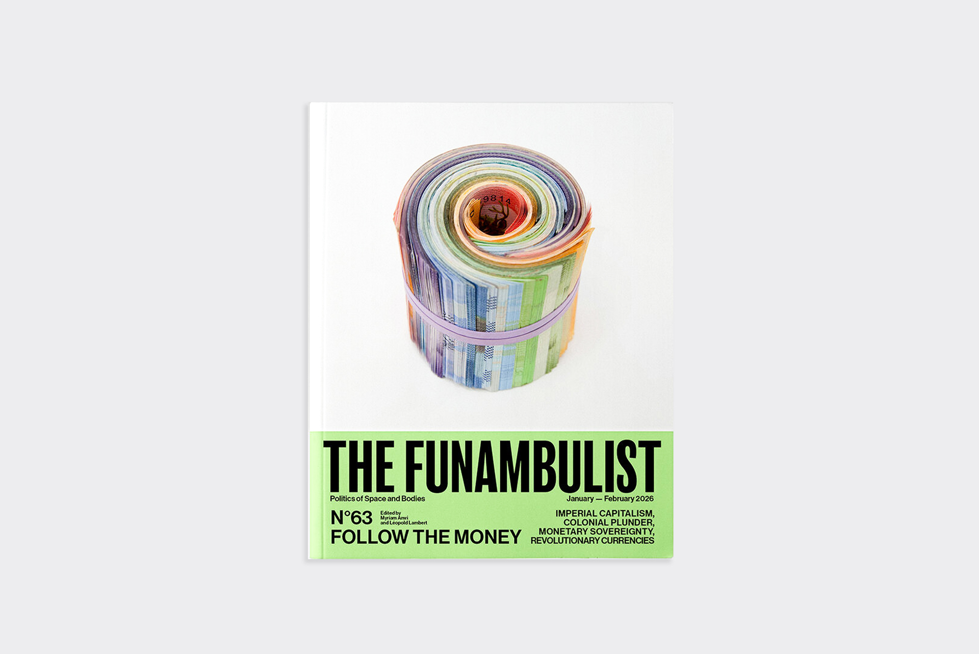 For this 63rd issue of The Funambulist, we teamed-up with Tunisian anthropologist and visual artist Myriam Amri and invite you to Follow the Money with us. In it, we enter the crevices of a capitalist system and trace it back to its central nodes: property, land, capital, and class. We read how money is central to colonial and imperial projects, but also how sovereignty and the liberation of our monetary imaginary can be tools of emancipation. From the CFA franc (Ndongo Samba Sylla, Moses März) to the US dollar (Lily H. Chumley) or the Palestinian Pound (Hicham Safieddine), we navigate monetary politics around the world, and more specifically in Sudan (Nisrin Elamin & Laleh Khalili), Puerto Rico (Roque Salas Rivera) or Brazil (Cho). The issue also contains a board game entitled “You’ve Got Yourselves a Revolution, Now What?” imagined by the issue editors Myriam Amri and Léopold Lambert and designed by Aude Abou Nasr. As for the cover, it features an artwork by Adriana Martínez Barón.